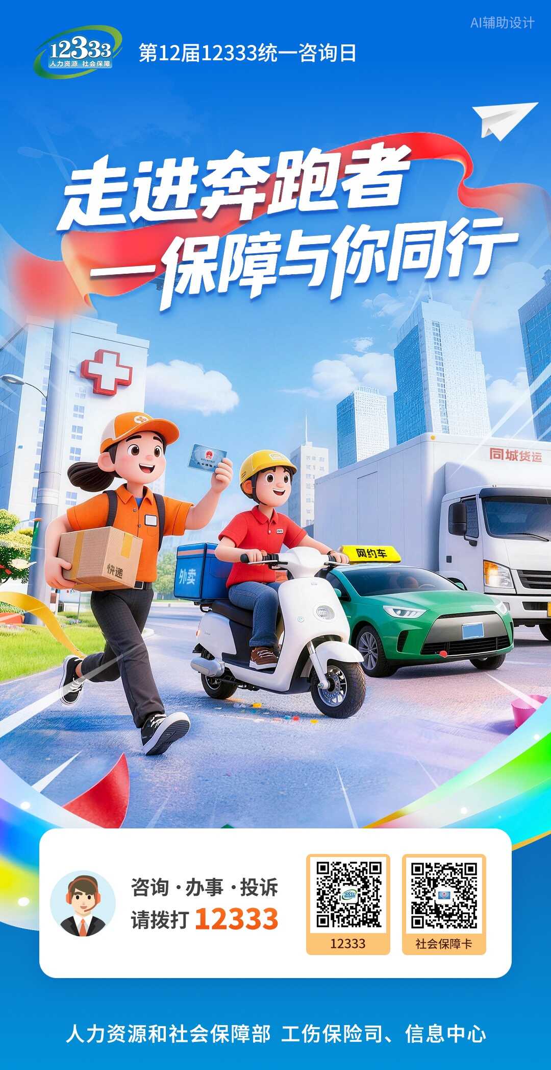 按照省人社厅统一部署,为促进平台经济健康发展、健全新就业形态人员社保制度,配合新就业形态人员职业伤害保障试点(基层快递网点优先参加工伤保险)实施,充分发挥人力资源社会保障12333热线服务品牌作用,我局将于3月30日开展“走进奔跑者——保障与你同行”为主题的第12届“12333全国统一咨询日”活动。